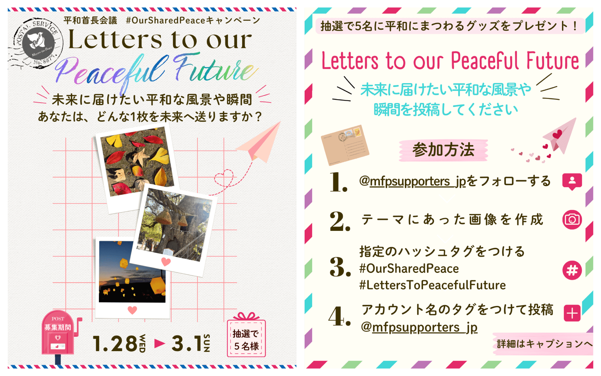 あなたが「未来に届けたい」と感じる平和な風景や瞬間を写真やイラストをインスタグラム上でエピソードとともに投稿してください。あなたの「平和の1枚」を未来への手紙のように投稿してみませんか?たくさんのご参加をお待ちしています!